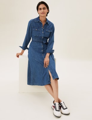 A classic round neckline and waist tie cinch in the middle and create a flattering silhouette with a stretchy shirred back for extra comfort. Chambray Button Front Mini Dress. A denim midi dress with short puff sleeves and a fitted silhouette. About Diversity Inclusion Careers Rakuten Contact FAQ. Belted Denim Midi Dress - Free UK Delivery - 10 12 14 16 18 20 22 24 - A chic maxi length day dress is just what your spring summer style needs. Inspired by workwear utility and designed in a flattering fit this belted denim dress will see you through the weekend in effortless style. From maxis to minis and everything in between our latest collection of dresses includes all this seasons must-have pieces.